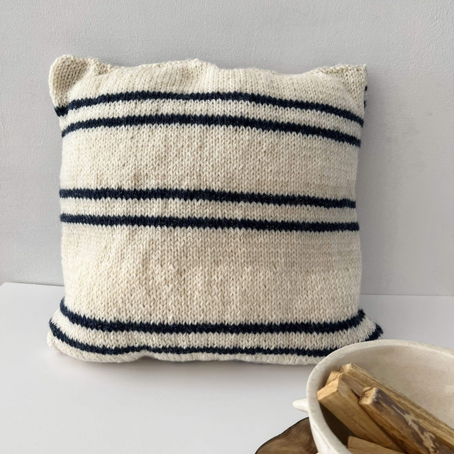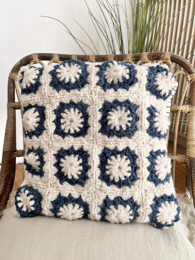 𐩘 Coussin de 30x30cm réalisé au crochet, en laine et coton. Recto de 2 couleurs : bleu et beige, et dos beige rayures bleues.