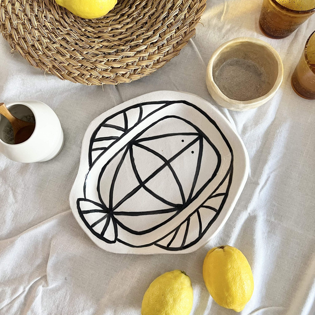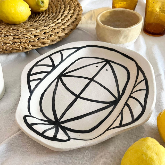 𐩘 Plat de 27x25cm environ. Grès naturel émaillé brillant, dessin noir.